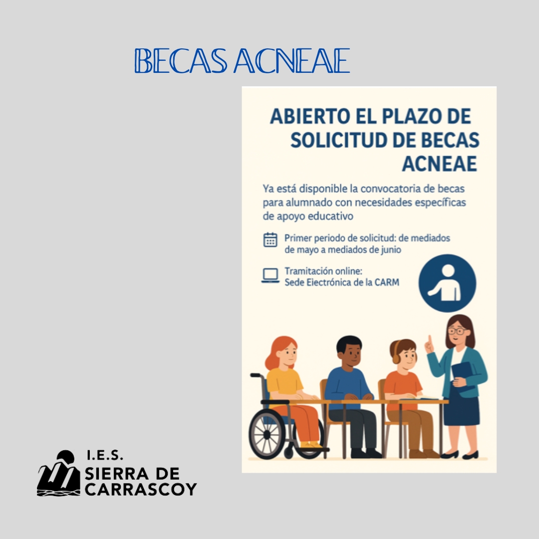🧩 Abierto el plazo de solicitud de becas ACNEAE Ya está disponible la convocatoria de becas para alumnado con necesidades específicas de apoyo educativo (ACNEAE), dirigidas a estudiantes que requieran apoyo especializado por motivos como discapacidad, trastornos del espectro autista, o atención logopédica o terapéutica, entre otros. 📅 Primer periodo de solicitud: de mediados
