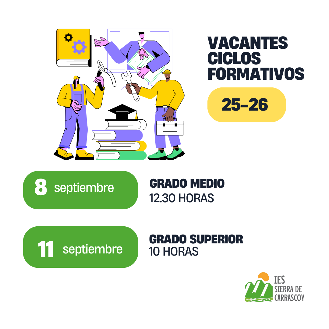 VACANTES DE LOS ACTOS DE ADJUDICACIÓN DE CICLOS FORMATIVOS GRADO MEDIO Y SUPERIOR CURSO 2025-26 GRADO MEDIO. 8 DE SEPTIEMBRE A LAS 12:30 HORAS. GRADO SUPERIOR. 11 DE SEPTIEMBRE A LAS 10:00 HORAS. CICLOS FORMATIVOS DE GRADO MEDIO Nº PLAZAS VACANTES INSTALACIONES FRIGORÍFICAS Y DE CLIMATIZACIÓN *No se hace llamamiento. Matrícula directa en secretaría hasta completar